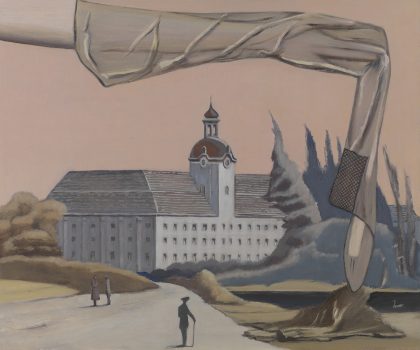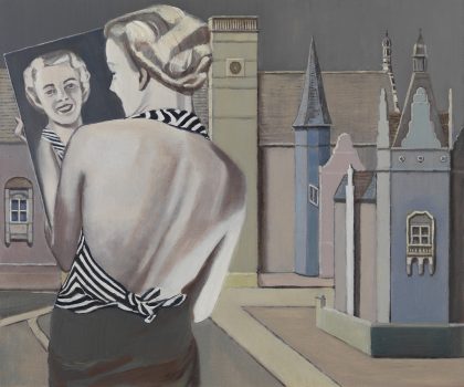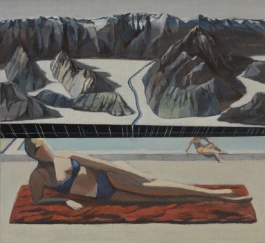 Diederik Gerlach (1956) verwijst in zijn schilderijen regelmatig naar het verleden. Hij put daarbij uit zijn archief van afbeeldingen uit oude reis- en reclamefolders en fotoalbums maar citeert ook uit de kunstgeschiedenis, met name de Duitse Romantiek. Na een zorgvuldig proces van formeren en deformeren krijgen deze beelden een nieuwe gedaante. Vaak is dat een alpine wereld die verborgen lagen en citaten bevat. De ruimte in het schilderij is meestal dubbelzinnig, aan de randen wordt de voorstelling afgebroken of het beeld wordt verticaal in tweeën gedeeld als een opengeslagen boek.