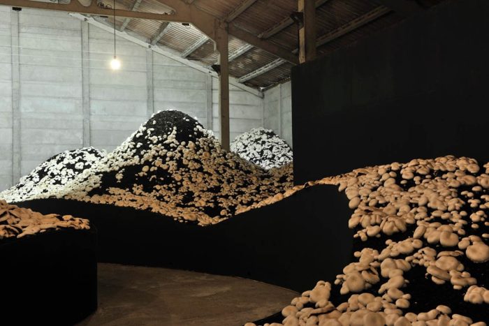 Op kunstfestival Watou #39 presenteert Zeger Reyers een installatie met champignons op zwarte aarde getiteld Behind the Wall, The Landscape.
