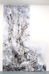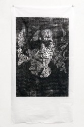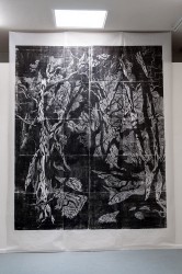 Nature is also the prime subject in Jos de l’Orme’s (1964) work, in expressive woodcuts he depicts forests, landscapes and animals. Recently he made a lifesize woodcut of a werewolf, the mythical creature in which man and animal are united. His main work in the exhibiton is a 3 meter high woodcut of a dark forest with barren trees that cast heavy shadows and whose branches pierce into a sky with swirling clouds. Because of the fierce movement of its lines the image is highly expressive and seems to mirror the artist’s emotions.