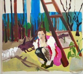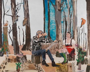 Andrea Freckmann (1970) paints stage-like spaces in which she depicts people in forests or parks. As if he were a music-making Orpheus, a man is playing a musical saw while birds and a girl in a Dirndl dress listen to him. This peculiar scene raises a number of questions. Are we indoors or outdoors, has this forest been painted or it is real and are we looking at actors or ‘ordinary’ people?