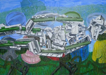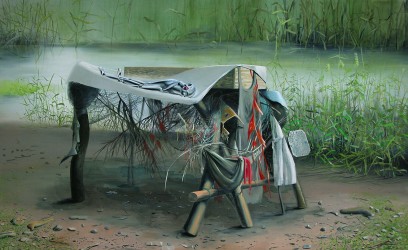 In his paintings, Urs Pfannenmüller (1942) depicts garbage as pieces of polystyrene foam and buckets lying in the grass. On closer inspection these objects resemble bodies or faces. Like a reversed Arcimboldo, the human shape is not made up of fruit, but of artificial materials. Because of their angular forms and white colour the polystyrene foam makes these figures resemble skeletons that can be regarded as contemporary Memento Mori’s.