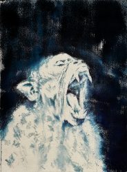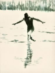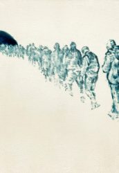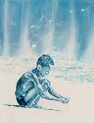In the series he also refers indirectly to his own childhood, a boy playing on the beach or looking into the water in a moment of introspection and innocence that will inevitably disappear. Other images are more symbolic like the man wading through the water or explicit with refugees in a winter landscape or a monkey screeching out of anger and frustration.