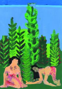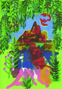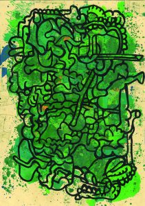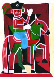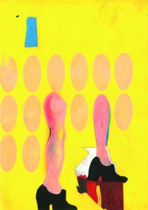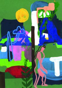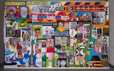 Jan Brokof (1977) was born in former Eastern Germany. In his early work the social environment of his youth with its Plattenbau apartment buildings and the chimneys of the local oilrefinery play a prominent role. He once made a completely three-dimensional reconstruction in woodcut of his boy’s room, including the sansevierias in the window sill and posters of Billy Idol, Baywatch and Madonna on the walls. Besides the woodcuts he made colourful drawings with a billboard like stilization in which human interaction and social structures are visualized. This stilization is also strongly present in the colourful collages that he starts making after that. In Berlin he met a Brazilian theatre group with which he went on tour in Brazil. His first visit to Sao Paolo gave him a culture shock similar to the one he experienced on his first visit to West Germany after the fall of the Berlin Wall.