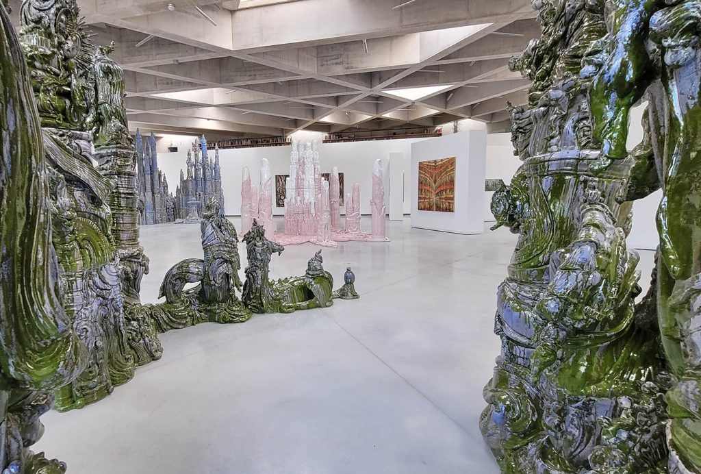 Elmar Trenkwalder’s (1959) monumental ceramic sculptures are displayed in the second part of the room. WVZ 250, part of the museum’s collection, is placed on the right and shows an assembly of light blue columns enclosing a central figure on a throne. WVZ 183 with its symmetrically placed fingers stands in the center, WVZ 360 with its organically twisting green stems and arches is placed on the left. This work was premiered at Museum Beelden aan Zee in 2022.