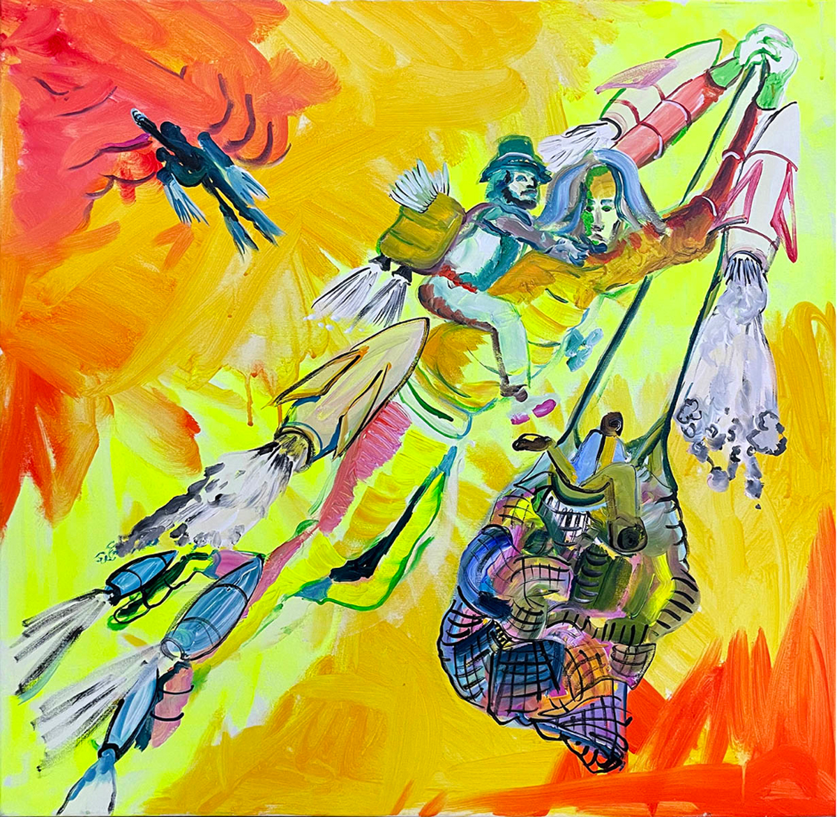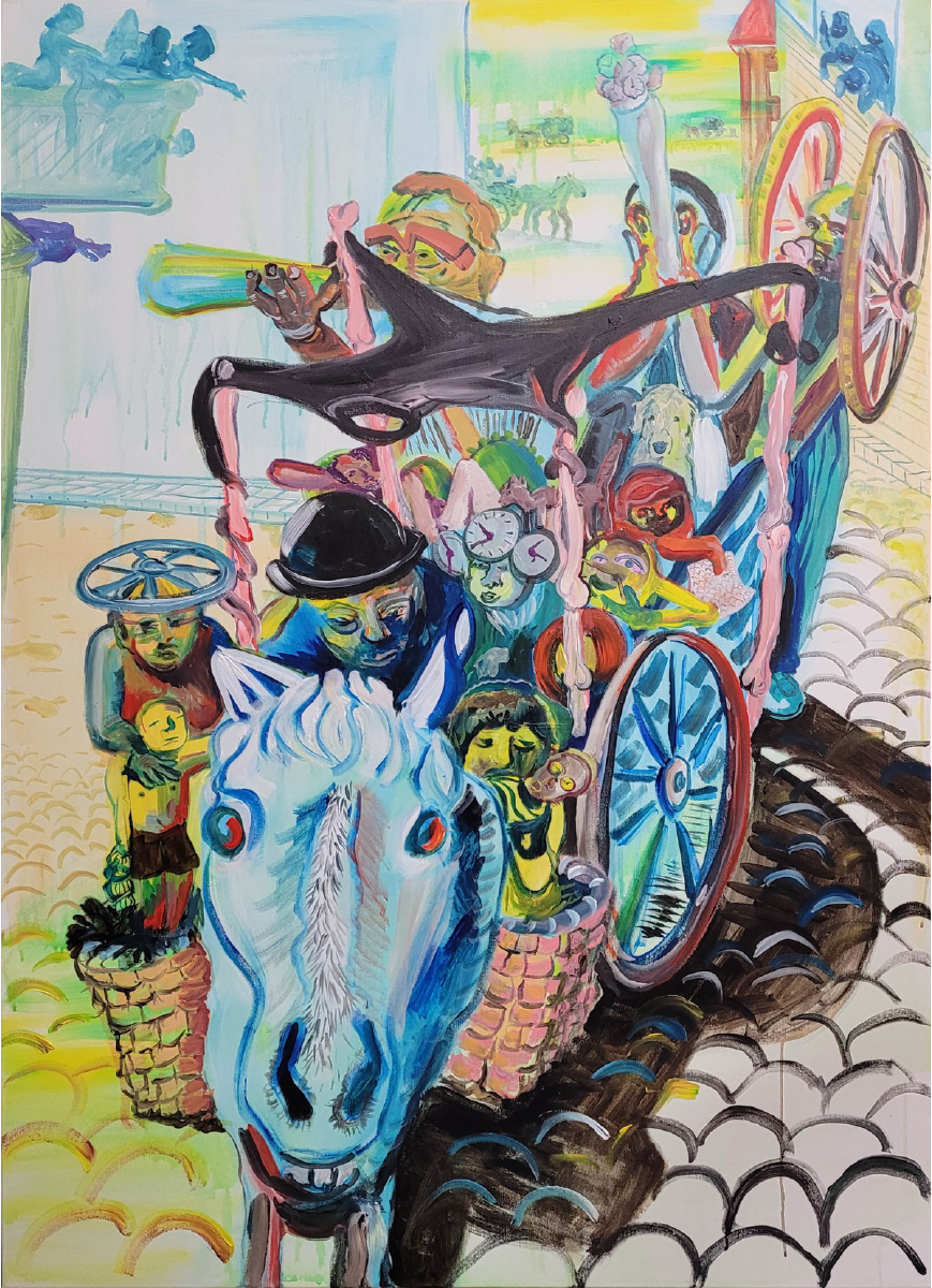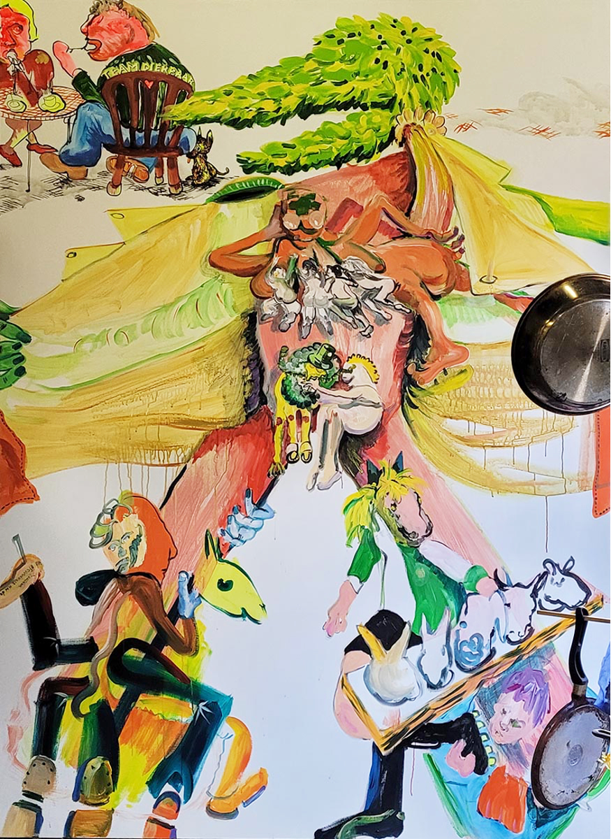 In his own work David Bade often addresses social themes like discrimination, inequality, and the might of economic power structures which he often depicts in a provocative and absurdist way. The humor in his work makes the sensitive topics accessible and opens up a positive approach to social issues. In the exhibition at the gallery David Bade presents several new spatial works in which traditional sculptures of saints are transformed. In No Non a statue of the Virgin Mary gets a new face and is given a pair of boxing gloves. He also shows new drawings and paintings that for instance depict cheerful wolves or chickens and birds revolting against the bio industry. In another work an alternative mass is celebrated in honour of the Mother, the Daughter and the Sacred Animal. David Bade wants his images to be inviting and contagious, fitting into what he calls the science of happiness.