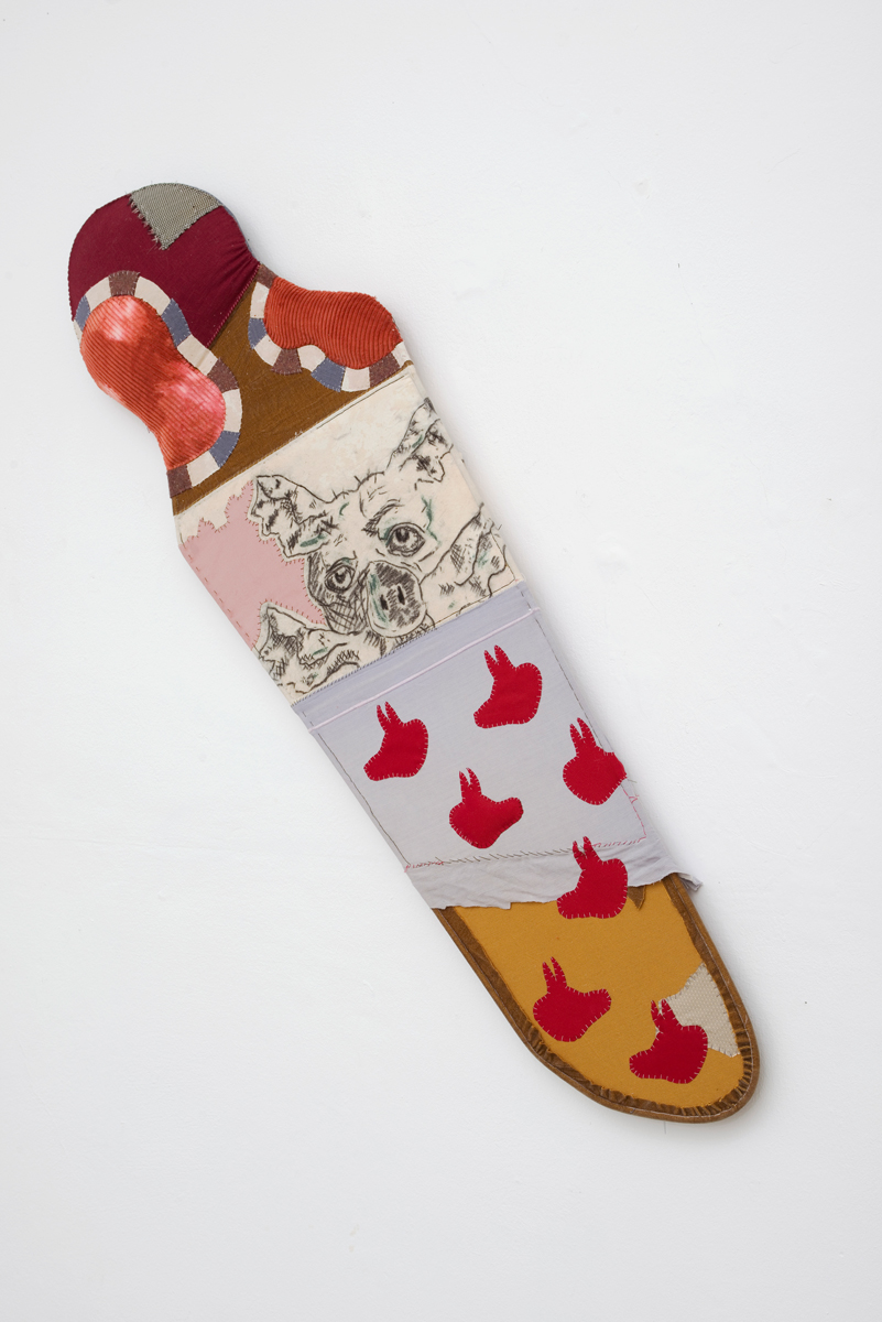 A virtuoso and diverse use of materials is present in all of his works. For example he cuts a spine from wood, symbolizing the transport of energy, and an animal’s head which is crowned with a textile umbrella that offers protection to the creature. The wood he uses is often weathered or damaged, alluding to the imperfection and fragility of nature that needs to be restored and healed.