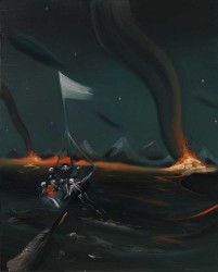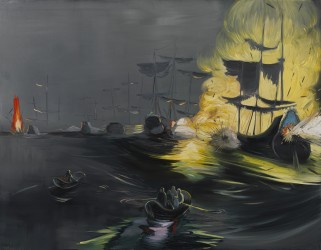 Rens Krikhaar (b. 1982) is highly interested in the tradition of both western and Asian art. About a year ago he took to the subject of seventeenth- and eighteenth-century seascapes. This also lead him to spend time studying maritime history bringing famous admirals such as Michiel de Ruyter and notorious raiders like Simon the Dancer to life. From this historic perspective he revives the tradition of maritime painting. His small canvases often show a delicate image in which the ships are painted in only a few brushstrokes. The bigger paintings have dramatic light contrasts and almost hallucinating colours in which violent images of fire and explosions, and men of war are rendered. Because of the exuberant colours and slight stylization of the image the paintings are unmistakably contemporary in character, one of Rens Krikhaar’s sea battles was shown at the annual exhibition for the Dutch Royal Award for Modern Painting in 2012 in Amsterdam.