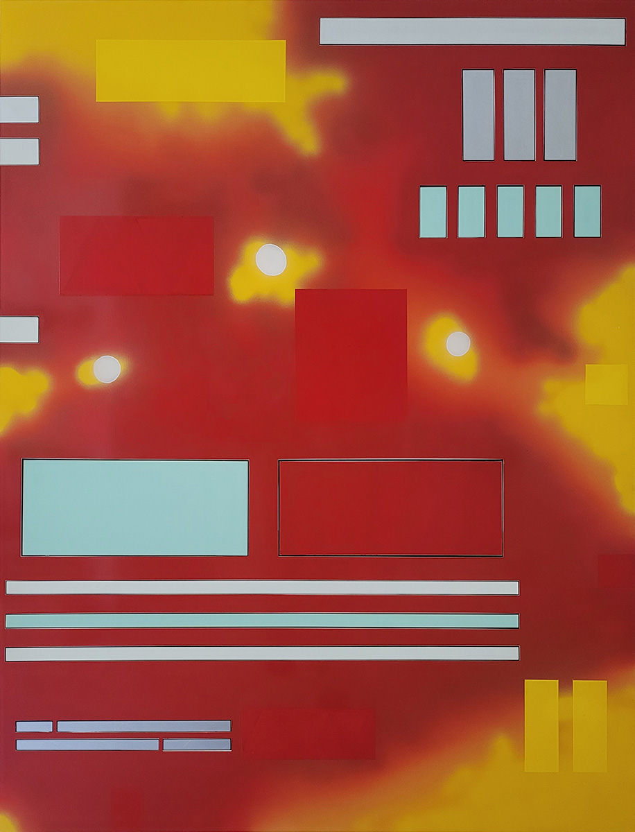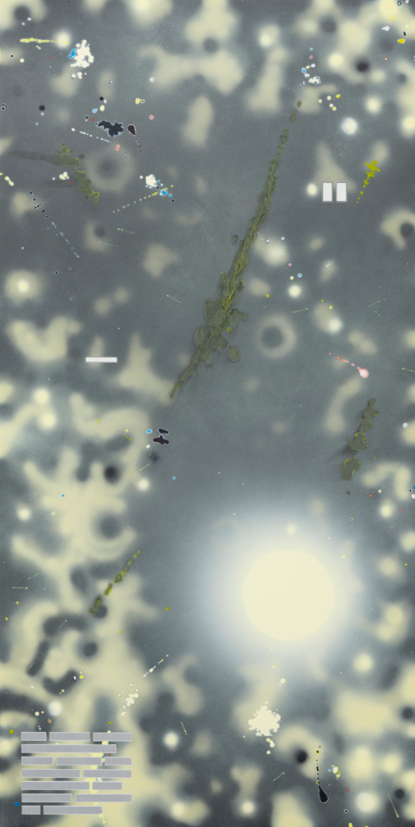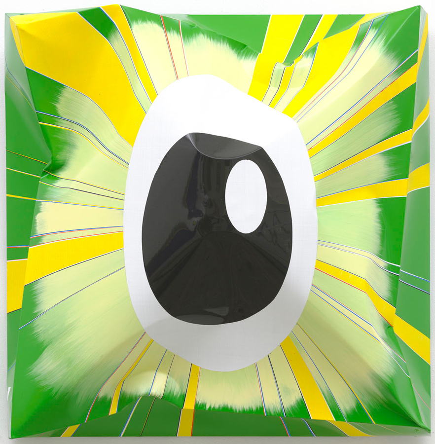 Han Schuil (1958) also manipulates the surface of his work, painting and spraying with high precision clusters of stars or supernovae, the bottom of a petri dish, or a Manga eye onto aluminium. Once finished, he dents the painting, giving the initially austere and autonomous image a soft and vulnerable quality.
