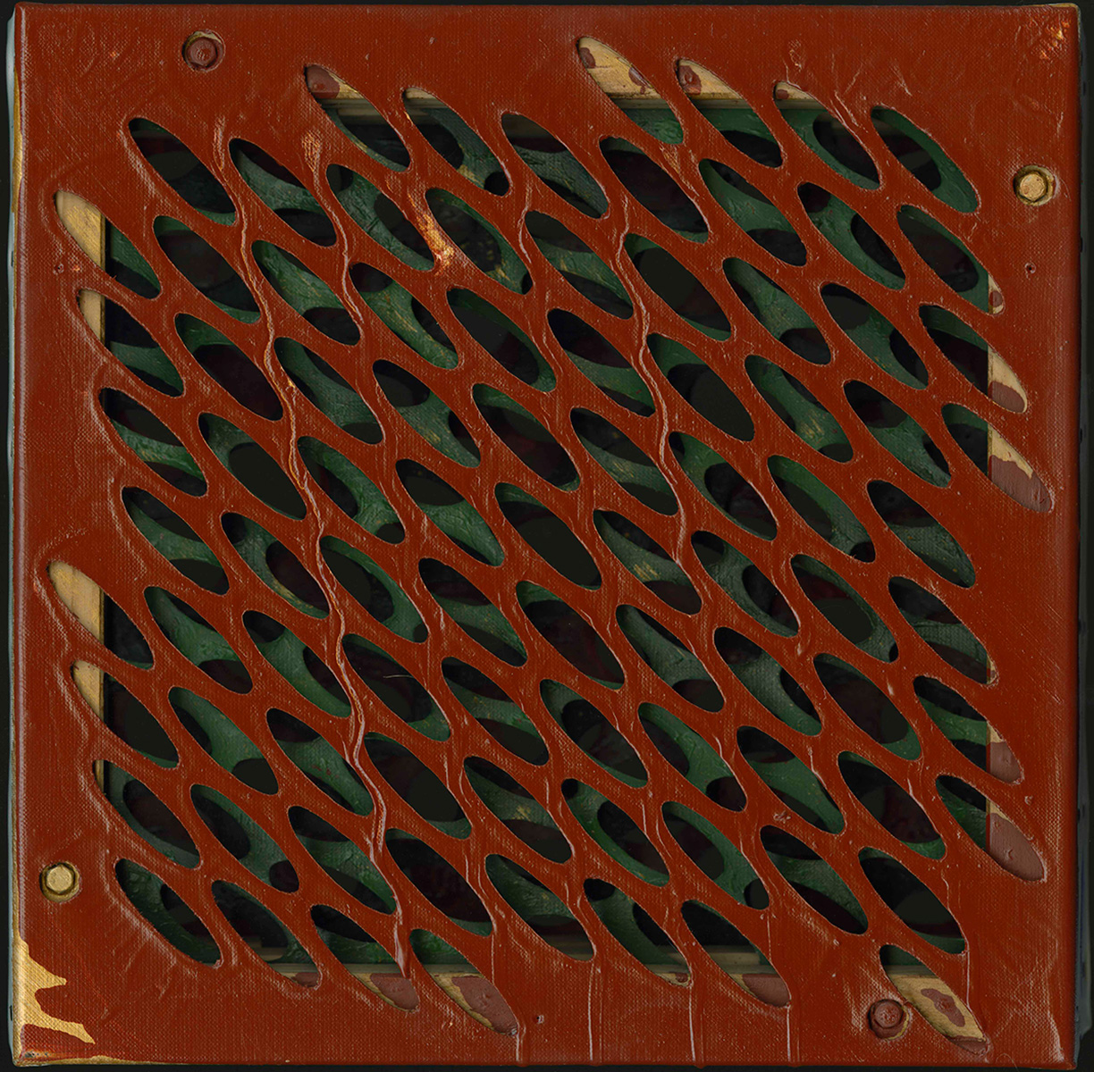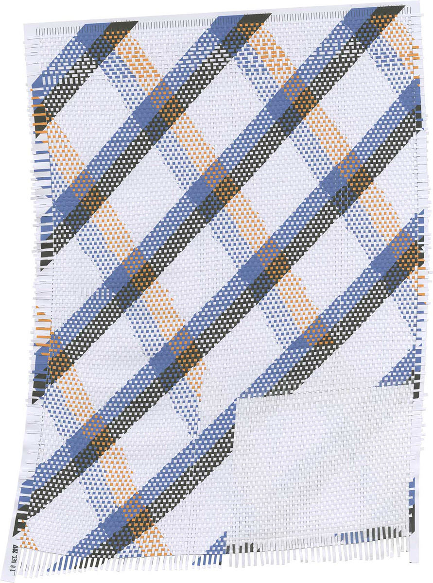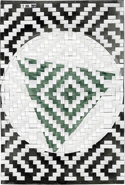 Henri Jacobs writes about this to Han Schuil : “One boldly folds the aluminum like a garment, the other cuts the paper into strips and weaves them together again to utilize the recto-verso properties of the two-dimensional surface. For one, the aluminum is almost a reference to a high-tech screen with floating rectangular text bars but without text, speechless text bars.” And: “You paint light blue or orange shards as if a sculpture has fallen and shattered. I create shards by interweaving geometric patterns, creating a fragmented image through chance. We’re both fascinated by the phenomenon of iconoclasm; anyone who is even remotely a painter should be an iconoclast…”