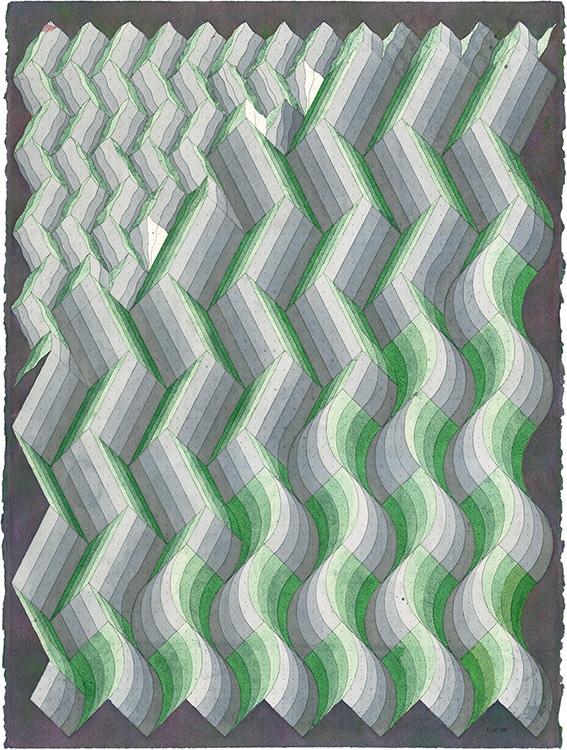 Where Henri Jacobs explores the surface of the drawing Han Schuil attempts to capture the absolute, to penetrate the mystery of life and death. In the gallery exhibition, Henri Jacobs’s interwoven drawings are presented in partitions perpendicular to the wall that contain a window displaying his pleated drawing making both sides visible. Between the partitions the paintings by Han Schuil are placed together with further drawings by Henry Jacobs. Besides this an elongated leporello drawing of a mountain range by Henri Jacobs is shown and as a pendant a long horizontal painting on shaped aluminium by Han Schuil.