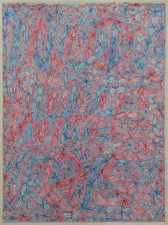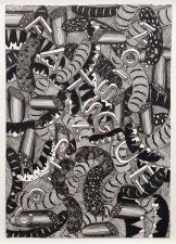 The eye is continually drawn back and forth between the movement of the individual brush strokes and the overall shape. Koen Taselaar (1986) often uses texts in his drawings. He incorporates words and sentences in a multitude of stripes and designs that unroll like a carpet. Because of the exuberance and liveliness of his patterns, it usually takes a while before the text can be deciphered.
