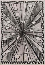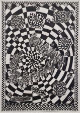 The avalanche of visual information in Taselaar’s work is excessive in a positive sense: joyful and almost psychedelically energetic. Excessiveness is also present in the work of the other artists; the virtuoso precision and craftsmanship that Henri Jacobs applies to his patterns and Gabler’s exhaustive search for the overall shape in his brush drawings.