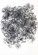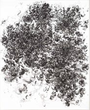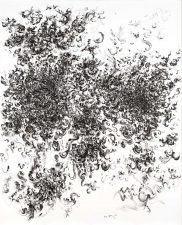 In his ongoing series Journal Drawings, Henri Jacobs (1957) explores how surfaces can be filled with geometric patterns. In the past few years he has been picking up some new themes during his research trips, such as undulating ornaments in Kolkata, India, and variations on the circle in Arita, Japan. For his latest works he started weaving patterns from small strips of paper, for this he recently traveled to Indonesia to study Ikat weaving. In Patrick Gabler’s (1967) work rhythm is important. His brush dances across the paper to create a pattern of curls that moves across the surface like a cloud of starlings that condenses into a definite shape.