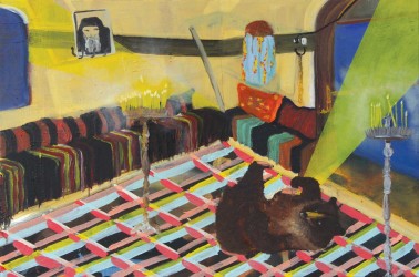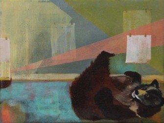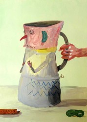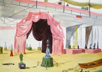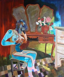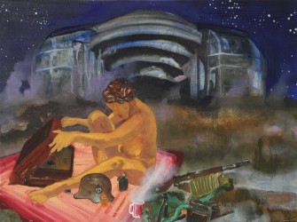 In Klokhuis (Core) a women is given a bird’s head; in 671SK Van Lieshout has painted a nocturnal scene with a bunker in the dunes and in the foreground a naked woman opening a suitcase that seems to contain a treasure. The aspect of discovering is a recurring theme in her work, almost as a metaphor for discovering and catching motives and forms during the process of painting.