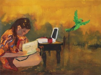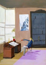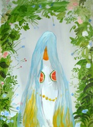 Lotte van Lieshout (1978) paints her perception of the world from a strong, personal perspective. Often, she herself is present in the paintings; portrayed in the immediate surroundings of her house or studio, or in an imaginary setting that sometimes refers to art history. By using bright colors and small interventions, the image is provided with magical connotations.