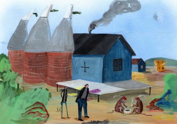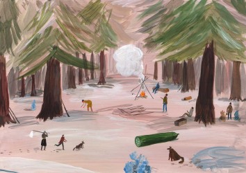Robert Nicol (UK, 1980) is a graduate of the Glasgow School of Art and The Royal College of Art, London. In a direct way that is related to folk and outsider art he paints a peculiar world in which human fears, hopes and desires occupy center stage. Often he depicts panoramic landscapes featuring small figures that are performing absurd actions.