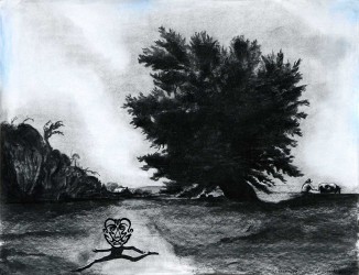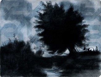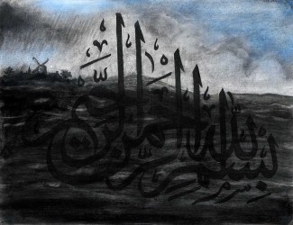 In much the same way as the 17th-century painters, he adapts the landscapes to his own needs. Here and there a little man, composed of calligraphic characters, wanders through the landscape; a reference to Jarram’s own situation as a Moroccan artist surrounded by Dutch culture. Sometimes the little man is carrying a flag that does not feature a radical Islamic slogan but the words I Love Art instead.