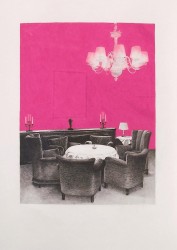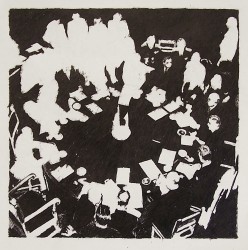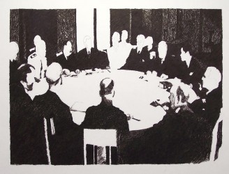Natasja van Kampen (1970) shows evil in a more covert form. She draws round conference tables with government leaders deciding over the fate of many. Her drawings depict conferences such as those of Yalta and Potsdam, where the division of post-war Europe was decided. Another work shows the empty armchairs in the lounge of the German Press Club in Berlin in 1936, where a large portrait of Hitler used to hang. In this drawing the portrait has been reduced to a neutral rectangular shape on the wall.
