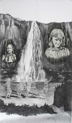 Marjolijn van der Meij (1970) makes large charcoal drawings in which she often uses old photos of student groups or people on a party or outing. She puts them in a strange new setting which undermines the naturalness of the original image and calls for a reassessment of the relations between the people depicted. A group of people in a room holding hands during a seance summon up a huge waterfall which reaches to the ceiling of the room. Other images seem more natural but have a latent disturbing atmosphere. As in the group of young people that dance to the music of a portable radio on the desolate bank of a river. A sense of desolateness and alienation is always present.