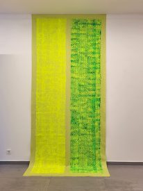 Textiles have protective and comfortable qualities, making the viewer feel enveloped and protected in the work thus immersing him/her in the effect of colour. Fransje Killaars’ installations have a strong autonomous quality but also address social and political themes that are touched upon without making them explicit. The work Toko, now on show in the exhibition Between Borders at Museum Arnhem NL, refers to the fate of refugees. The political crisis in 2000 in Kosovo causing a large number of displaced people inspired Fransje Killaars to make the work. It consists of a huge tarpaulin with four colour strips in yellow and green hanging from wall to wall. On it lies her so-called alphabet, consisting of materials such as bags filled with wool, hand-woven carpets and fabrics. The installation Image of Power shown in the Textile Biennial at Museum Rijswijk is inspired by the theme of human rights and the right to freedom in particular.