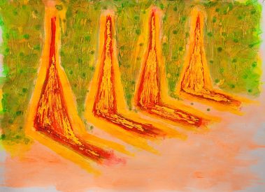 Galerie Maurits van de Laar is pleased to announce the collaboration with artist Fransje Killaars, who opens the new gallery season with the solo show THE INTUITION. In addition to hand-blockprinted fabrics, the exhibition features work on paper, folding screens and two installations: THE INTUITION and After Image. Both works incorporate human figures that you can see as mediators for the viewer. They lead you into the installation and function as carriers of meaning and the viewer’s projections. The kneeling figures in THE INTUITION evoke associations with stillness or contemplation, the figures in After Image. disappear further and further into their veils to eventually become pure colour.