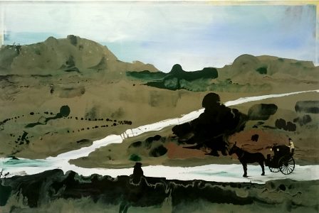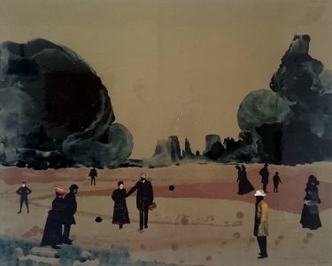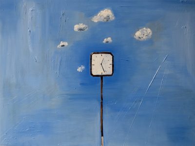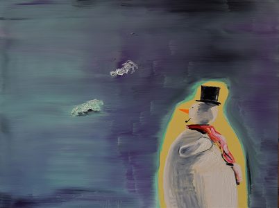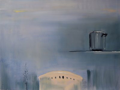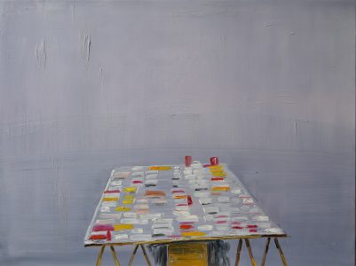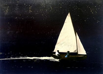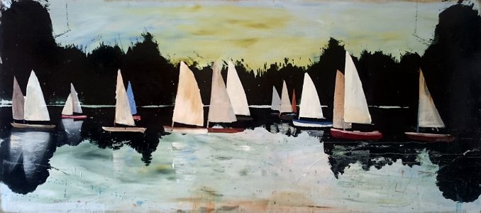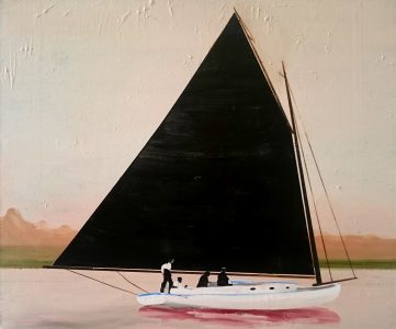 Ronald Versloot (1964) schilderde recent een serie werken met zeilboten waarin hij een bijna abstracte compositie maakt met het rechtopstaande vlak van het zeil dat haaks op het liggende vlak van het water staat. Kenmerkend is Versloot’s directe en simpele manier van schilderen waarbij hij met een minimum aan middelen de voorstelling opzet. Daarbij maakt hij ook gebruik van lak die het oppervlak doet glanzen en laat hij een zeil soms onbedekt zodat het linnen van het schilderij letterlijk als doek fungeert. In andere schilderijen experimenteert hij met glans- en epoxylak om een landschap tot leven te brengen, als in een toneeldecor plaatst hij daarin met sjablonen menselijke figuren.