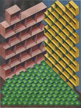 Naast horizontaliteit is in andere tekeningen ook verticaliteit aanwezig. Een verticale infrastructuur van trappen in lege hulzen van huizen, van de kelder tot zolder, met raam- en deuropeningen in muren zo dun als papier. Lege decors waar het toneel verlaten is, waar de mens weggelaten is. Een plaats waar je kunt halt houden, waar gestopt is met het vertellen van verhalen.
