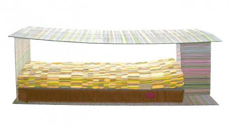 Martin Fenne (1964) maakt textielreliëfs met glimmende reepjes stof die hij dakpansgewijs over elkaar legt. In het verleden maakte hij daarmee onder meer de serie Sleepers waarin mensen liggen of zitten op matrassen. In de werken die daarop volgen wordt het onderwerp neutraler: kartonnen dozen die volgens dezelfde arbeidsintensieve methode worden opgebouwd uit satijnen biezen. Omdat de zittende of liggende mensen nu ontbreken onttrekt de voorstelling zich aan een directe identificatie en gaat de aandacht heen en weer tussen de concrete vorm van de doos en de abstracte structuur van de horizontelen en verticalen van de reepjes stof. De voorstelling is opgebouwd in een kleurstelling die heel subtiel in elkaar overgaat of juist sterke contrasten heeft, door de vleug van het glimmende satijn wordt die werking versterkt.
