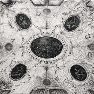 In Robbie Cornelissen’s solotentoonstelling in de galerie zullen meerdere tekeningen op groot formaat uit Kantelpunt 1 worden getoond, samen met klusters van kleinere werken.