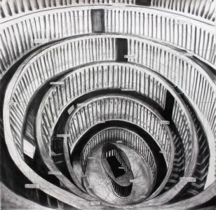 Robbie Cornelissen (1954) is een tekenaar die de grenzen van het medium onderzoekt. Onlangs was in de Cacaofabriek Helmond de indrukwekkende installatie Kantelpunt I, waarin zijn tekeningen een samenspel aangingen met de ruimtelijke voorwerpen van Karin van Dam. De tekeningen van Robbie Cornelissen fungeerden niet alleen als beeld met een imaginaire ruimte maar hadden ook een fysieke rol. Twee reusachtige lijntekeningen hingen verticaal in de ruimte, als een waterval van lijnen die van vijf meter naar beneden stroomde, even concreet als Karin van Dam’s objecten en ruimtelijke constructies.
