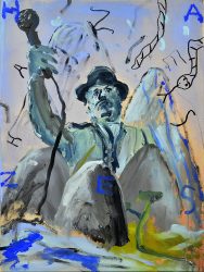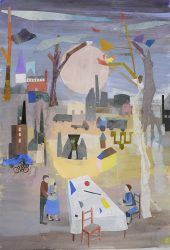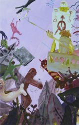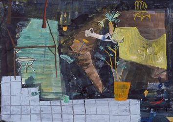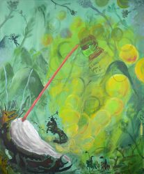 Sam Hersbach (1995) exposeert voor het eerst, zijn schilderijen hebben intrigerende titels als (Ziekenhuis) schoonmaakdienst ten strijde tegen ongebalanceerde kruipers, of Clumsy catfish hunting a mysterious horse rider. Ze zijn met vaart geschilderd in brutale kleuren, waarin figuren en dieren tussen kegelvormige bergen als in een hallucinatie opdoemen.