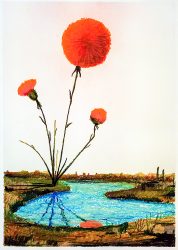 Dan Zhu (1985) maakte nieuw werk op papier In The Lightning zie je een nachtvlinder in een donkere lucht. Vanaf zijn vleugels lopen lijntjes die eindigen in oranje stippen waaruit kleine bliksemschichten schieten. Als zaadjes die nieuw leven verspreiden, brengen ze de nachtelijke blauwe hemel tot leven.